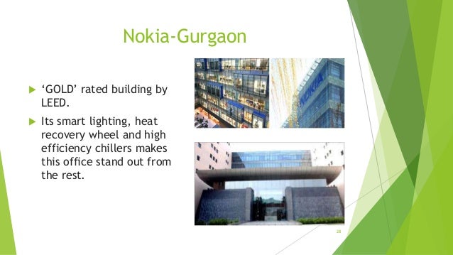 NOKIA- GURGAON HARYANA Among Indias most sustainable buildings is the corporate office of Nokia in Gurgaon which has been granted accreditation as one of the worlds leading green buildings by the US. Sehgal Foundations headquarters green building in Gurugram Haryana was constructed according to the Platinum standards of Leadership in Energy and Environmental Design LEED set by US. ITC is one of the corporate giants of India with a diversified business ranging from agro products to hotels and from FMCG to paperboards and specialty papers etc.